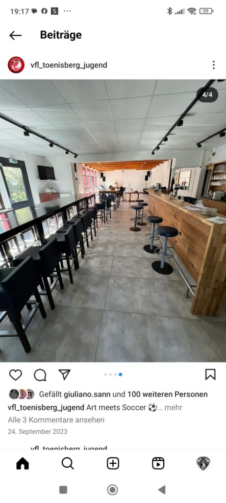 Das Klubhaus Tönisberg, geführt von Micky, ist ein beliebter Treffpunkt für Spieler, Familien und Gäste des VfL Tönisberg. Ob gemütliches Beisammensein nach dem Spiel bei Kaffee, Bier oder kalten Getränken, eine Bratwurst während des Spiels oder eine kleine Eis-Überraschung für die Kids im Sommer – Micky ist für alle da und sorgt für eine herzliche Atmosphäre.